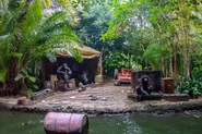The gorillas are passed by ransacking the base camp in every version of the Jungle Cruise. One fires a gun into the water, another puts tries on a pith helmet in a mirror, a mother plays with her baby, and another gorilla examines the barrel of a rifle. Moving along, the boats encounter Kejo attempting to grab a crate floating in the water.