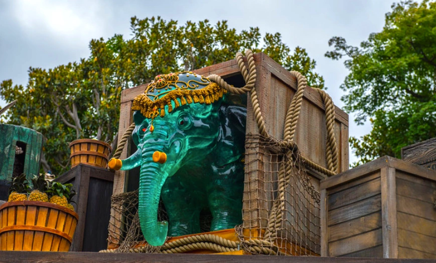 The elephant sculpture's origins are unknown. The elephant may have been connected to a domesticated elephant named Penny who died (likely related to a mouse related incident) and was buried in a crypt in the pet cemetery outside of the Haunted Mansion in New Orleans. The sculpture appeared to have once been located in the Gibson Girl Ice Cream Parlor of Main Street, U.S.A. in Marceline, Missouri around the turn-of-the-century. In the late 1930s, the sculpture was seen in a crate, being shipped by the Jungle Navigation Company and stored atop the shop Tropical Imports.